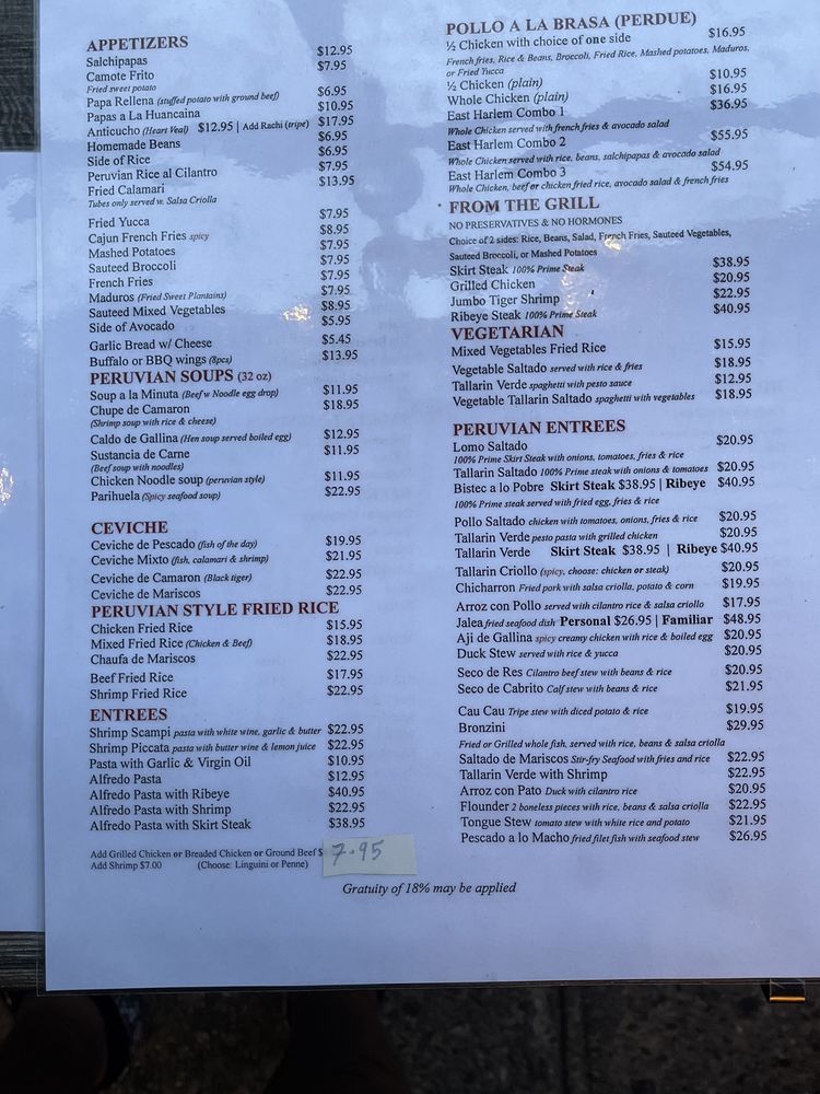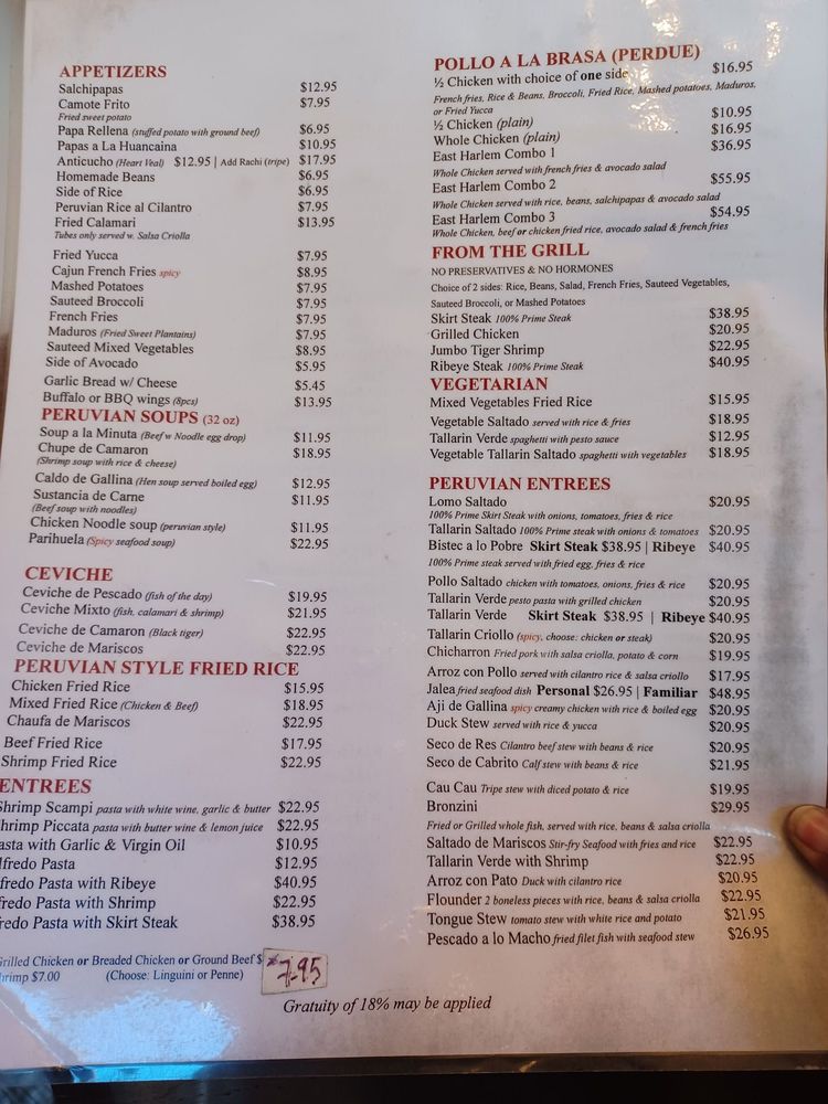 Quechua Nostra Peruvian Food in Spanish Harlem offers a variety of authentic Peruvian dishes with a cozy and welcoming ambiance. Their highlights include the flavorful Lomo Saltado, a must-try dish with juicy skirt steaks. The menu features traditional Peruvian appetizers like Salchipapas and Papa Rellena, as well as hearty Peruvian soups such as Chupe de Camaron and Caldo de Gallina. The salads, including the Avocado Salad and Cesar Salad, are fresh and vibrant. Customers praise the friendly staff and delicious food, making it a popular spot for lunch or dinner. With options for vegetarians and great service, Quechua Nostra is a hidden gem for Peruvian cuisine enthusiasts in the area.